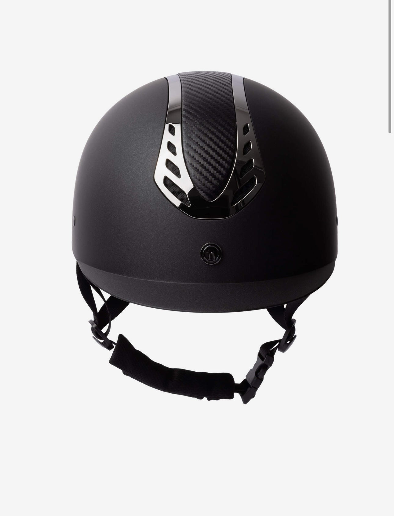 Ce casque d'équitation sophistiqué allie sécurité, confort et design moderne. Sa coque extérieure en noir mat offre un look intemporel, tandis que son cadre supérieur en métal poli couleur gunmetal apporte une touche raffinée. L’insert en carbone noir renforce son élégance sportive. Équipé d’une visière standard et d’ouvertures de ventilation, ce casque assure une circulation d’air optimale pour un confort maximal. La mentonnière offre une protection supplémentaire, et la doublure intérieure amovible et lavable facilite l’entretien. Un discret logo métallique sur le front ajoute une touche d’exclusivité. Livré avec un sac de transport pour le protéger de la poussière et des rayures.