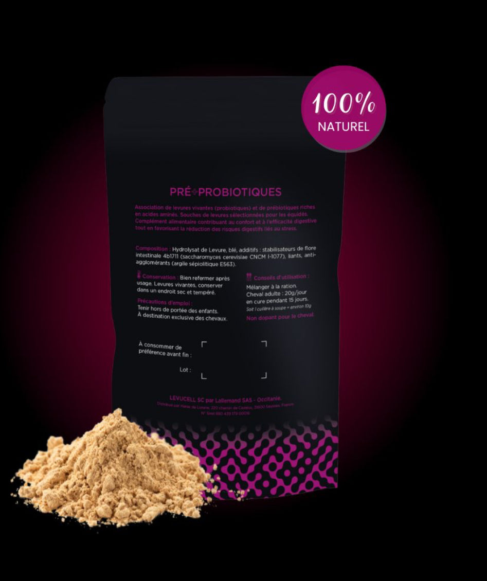Association de levures vivantes (probiotiques) et de prébiotiques riches en acides aminés. Souches de levures sélectionnées pour les équidés. Complément alimentaire contribuant au confort et à l’efficacité digestive tout en favorisant la réduction des risques digestifs liés au stress.